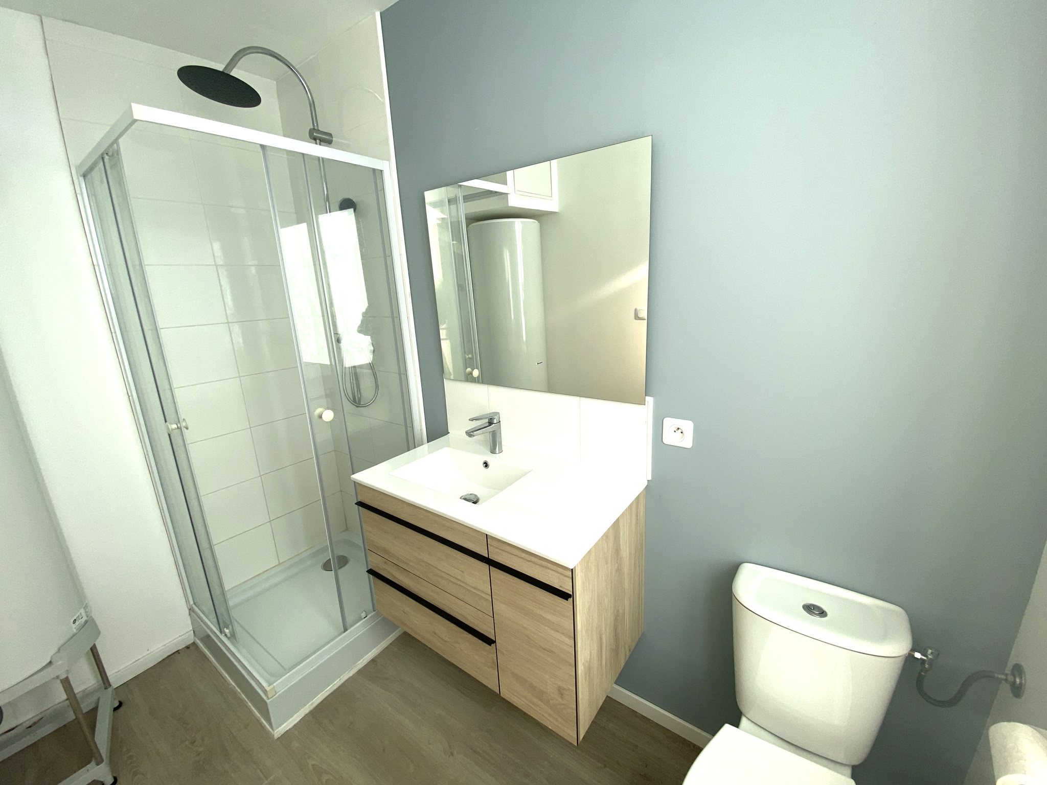 D'une pièce de vie avec cuisine équipée (four, plaques, hotte), salle de douches avec WC, une chambre.