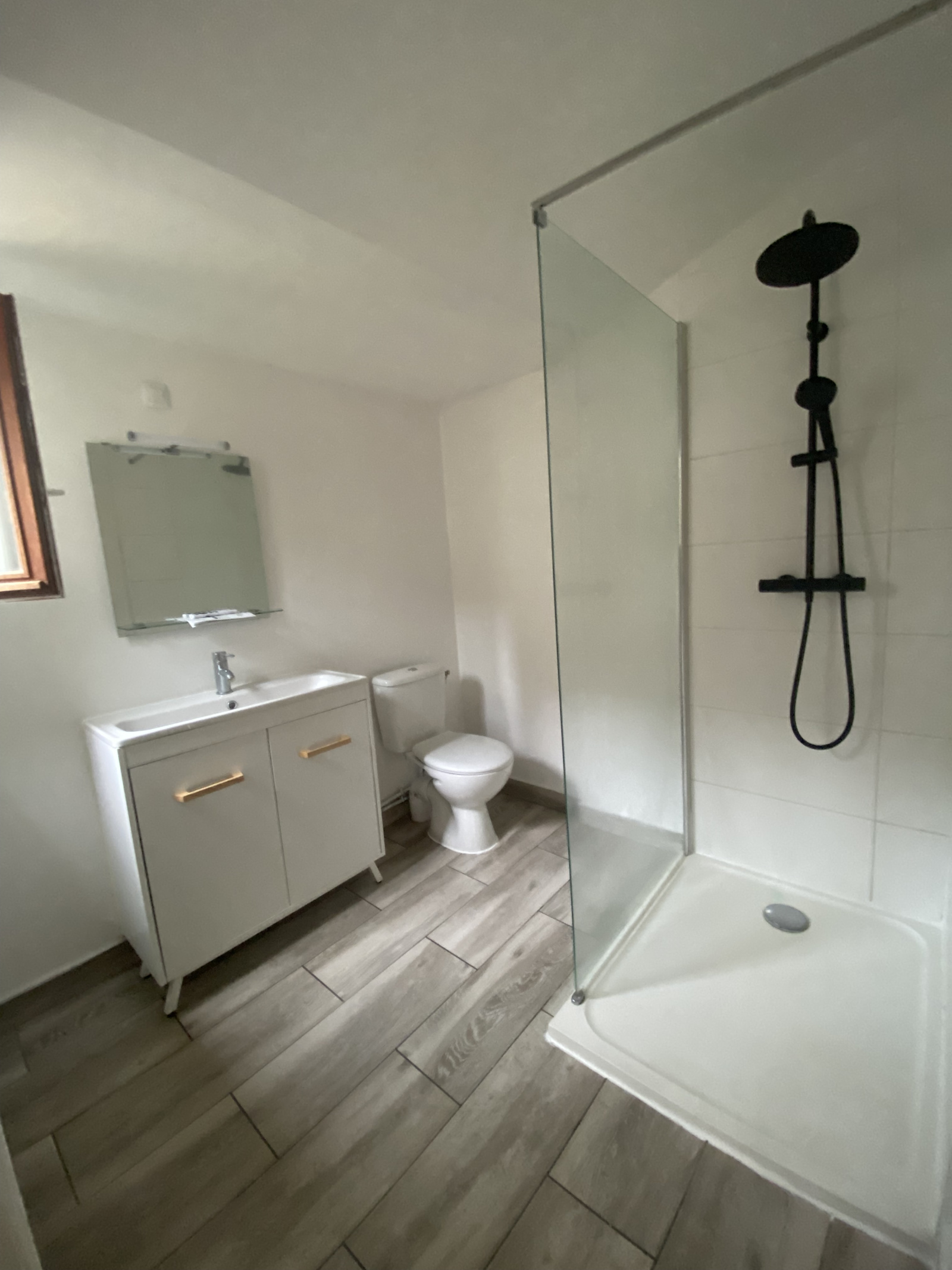 Cette maison comprend : un séjour, une salle à manger, une cuisine (plaques, four et meubles de rangements), une salle de douches avec WC.
