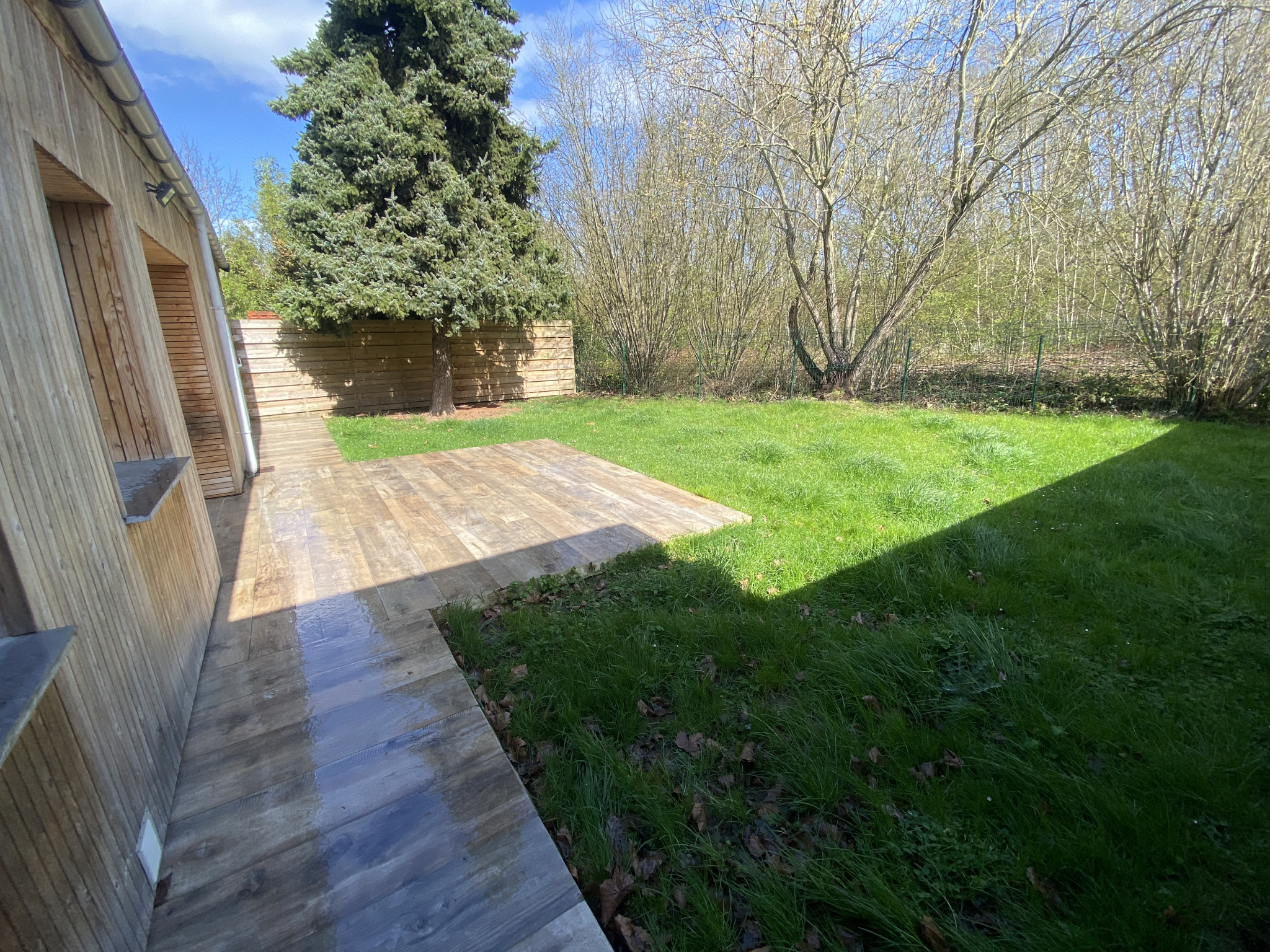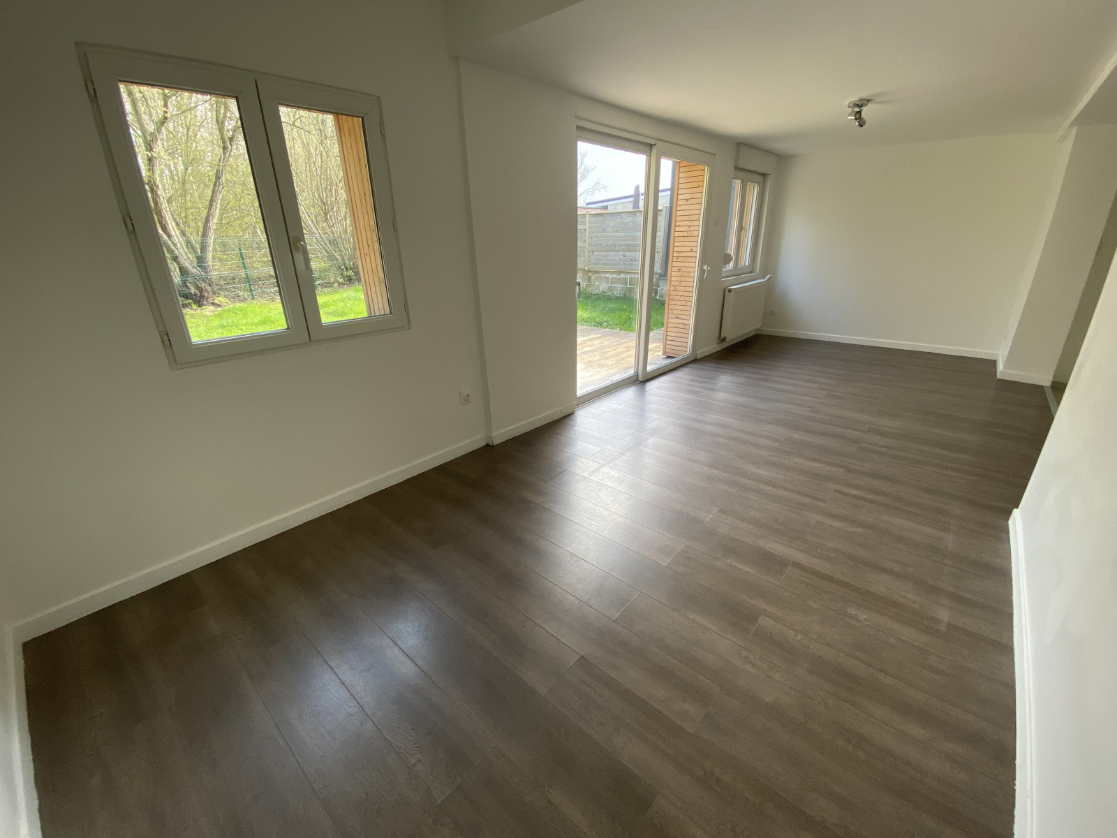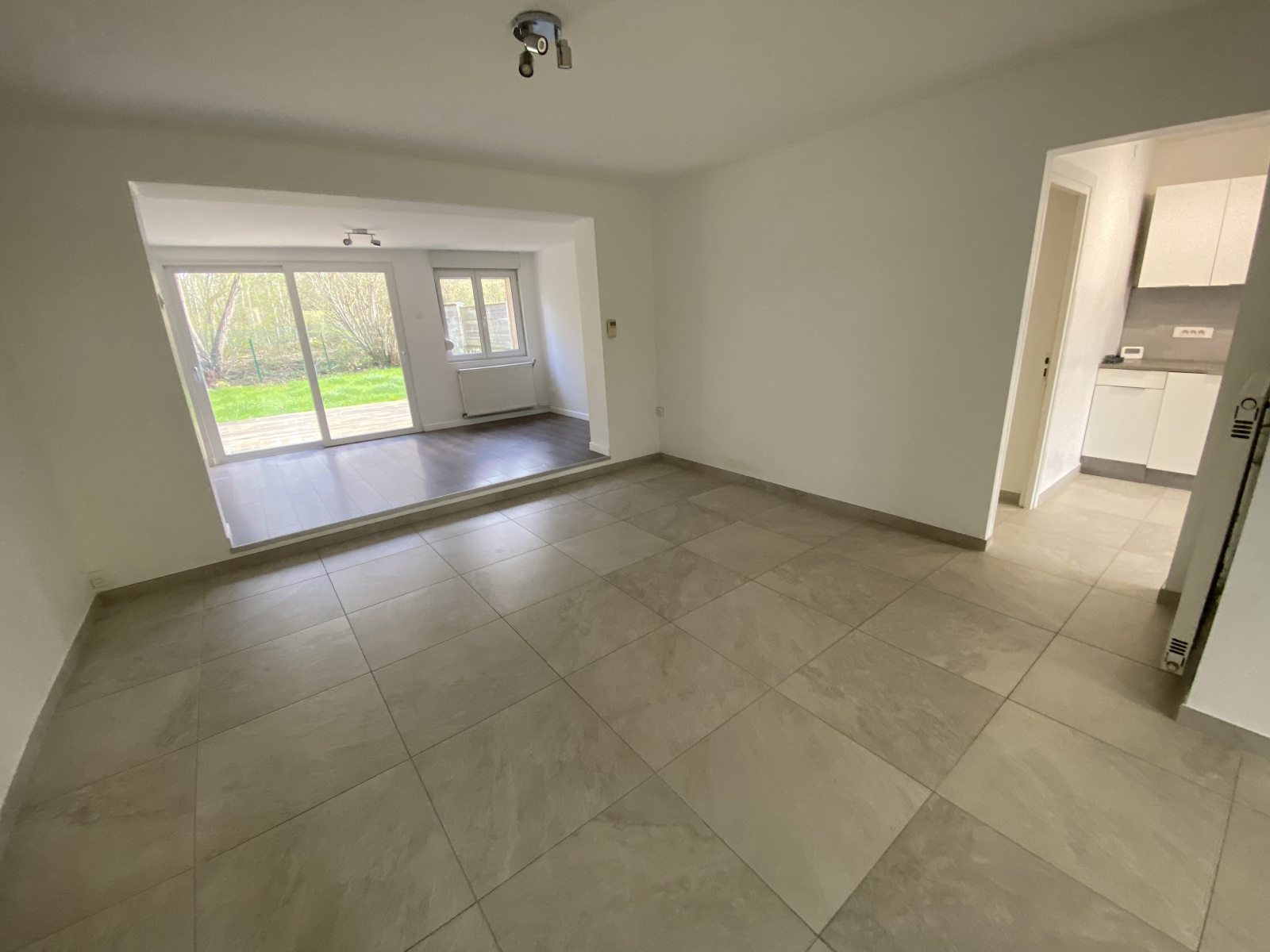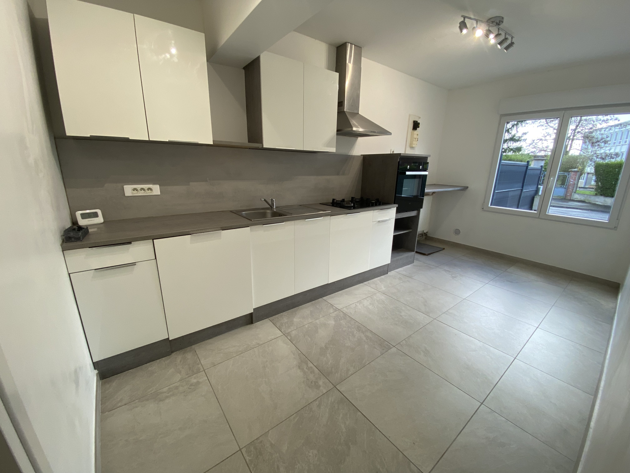 Maison mitoyenne à Marly comprenant : Un séjour en 3 parties, une cuisine aménagée et équipée (four, plaques, hotte, lave-vaisselles), une buanderie,