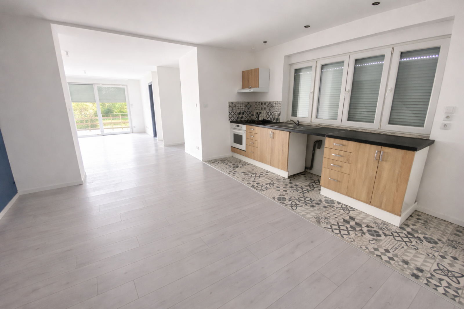 Maison comprenant : un hall d'entrée, WC, un grand séjour en 2 parties, une cuisine aménagée et équipée (plaques, four, hotte) emplacement pour le lave-vaisselles,