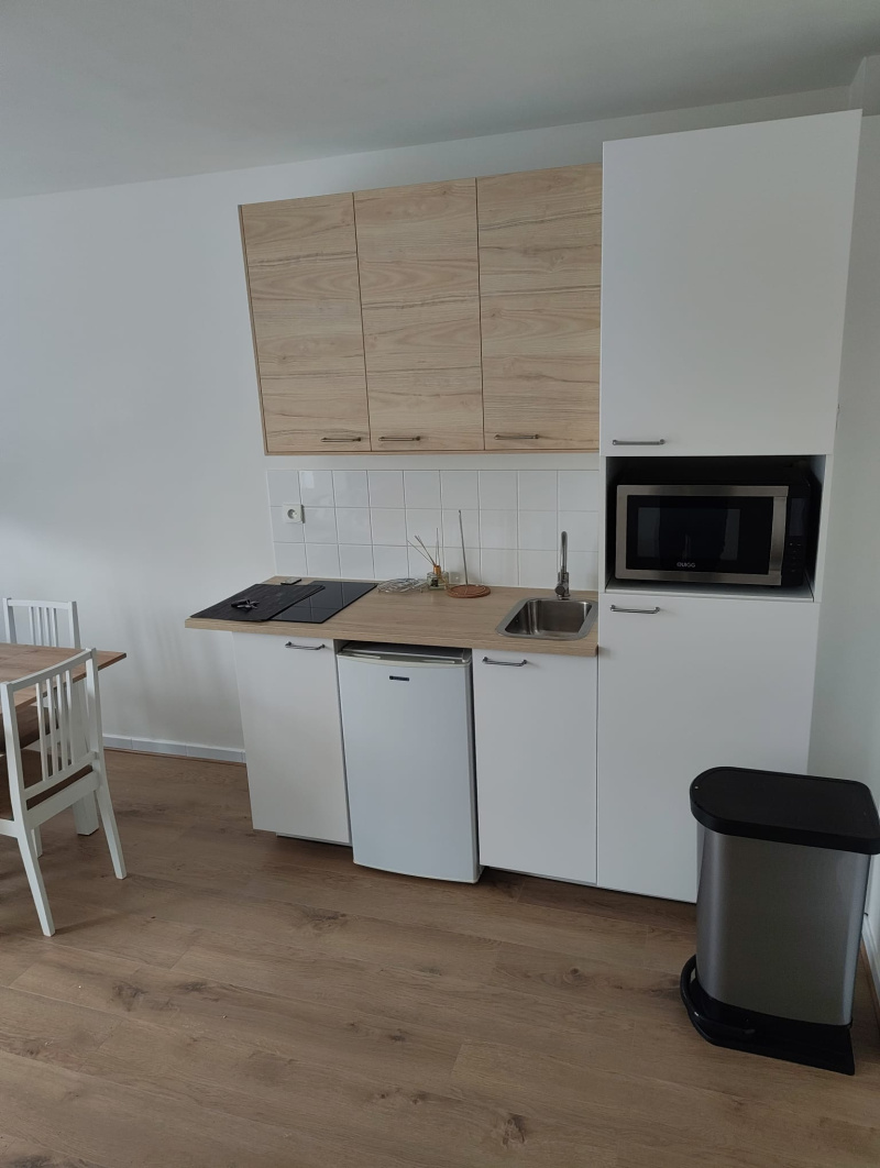 Grand séjour avec cuisine aménagée et équipée (réfrigérateur et plaques), salle de douches, WC.