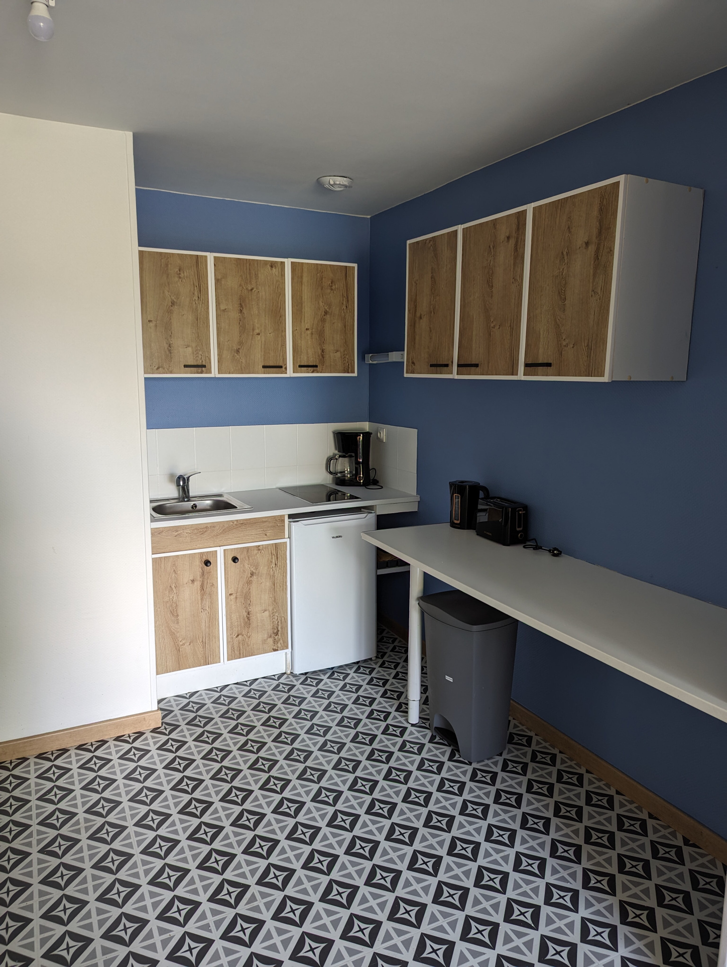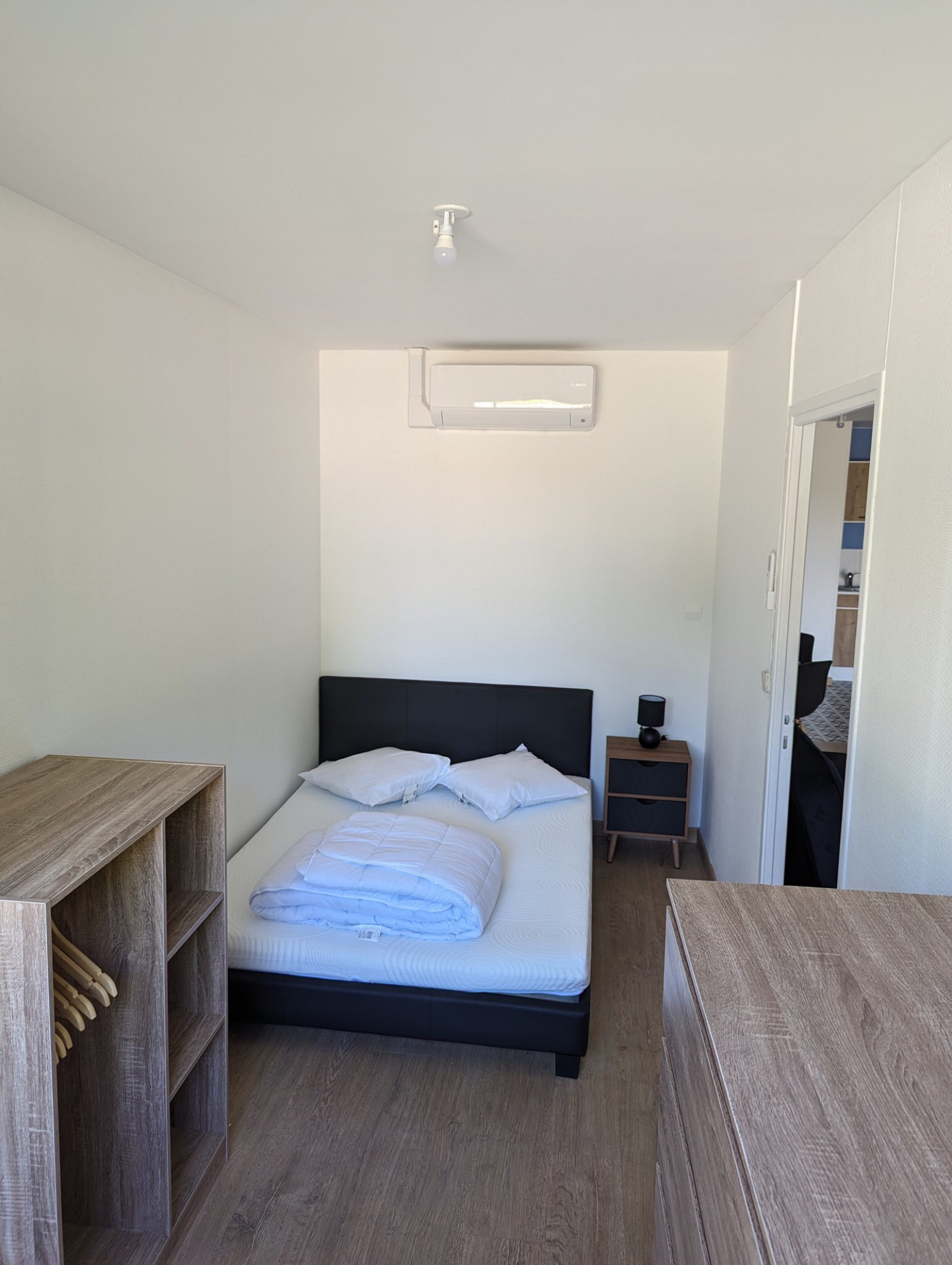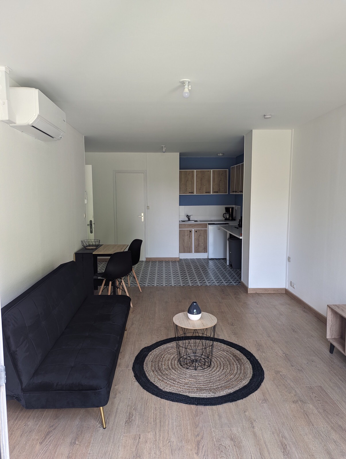 Une pièce de vie avec cuisine ouverte et équipée,une chambre et une SDB , WC