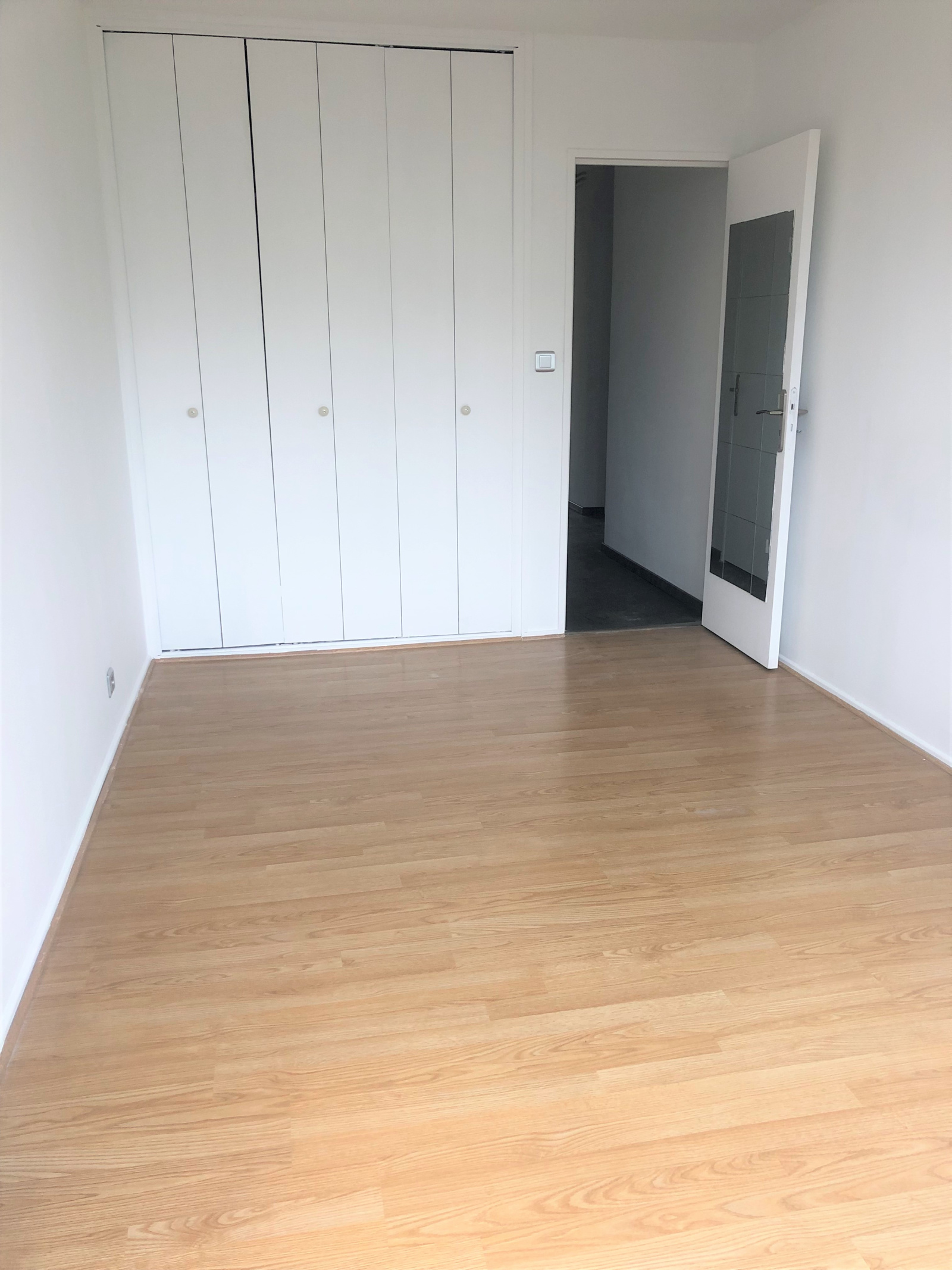 un couloir déservant une salle de douches, WC séparé, et 2 chambres dont une avec placard et accès au balcon. Appartement traversant, entièrement repeint.