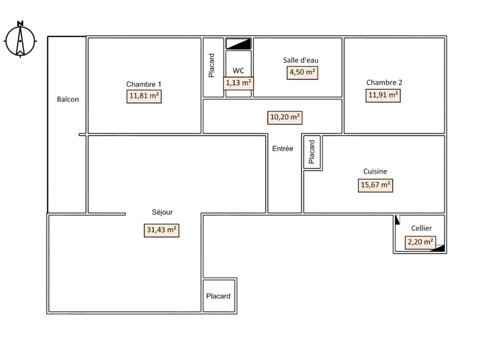 Un hall d'entrée avec placard, un grand séjour en 2 parties avec accès au balcon, une cuisine entièrement équipée et aménagé de 15 m² avec un cellier,