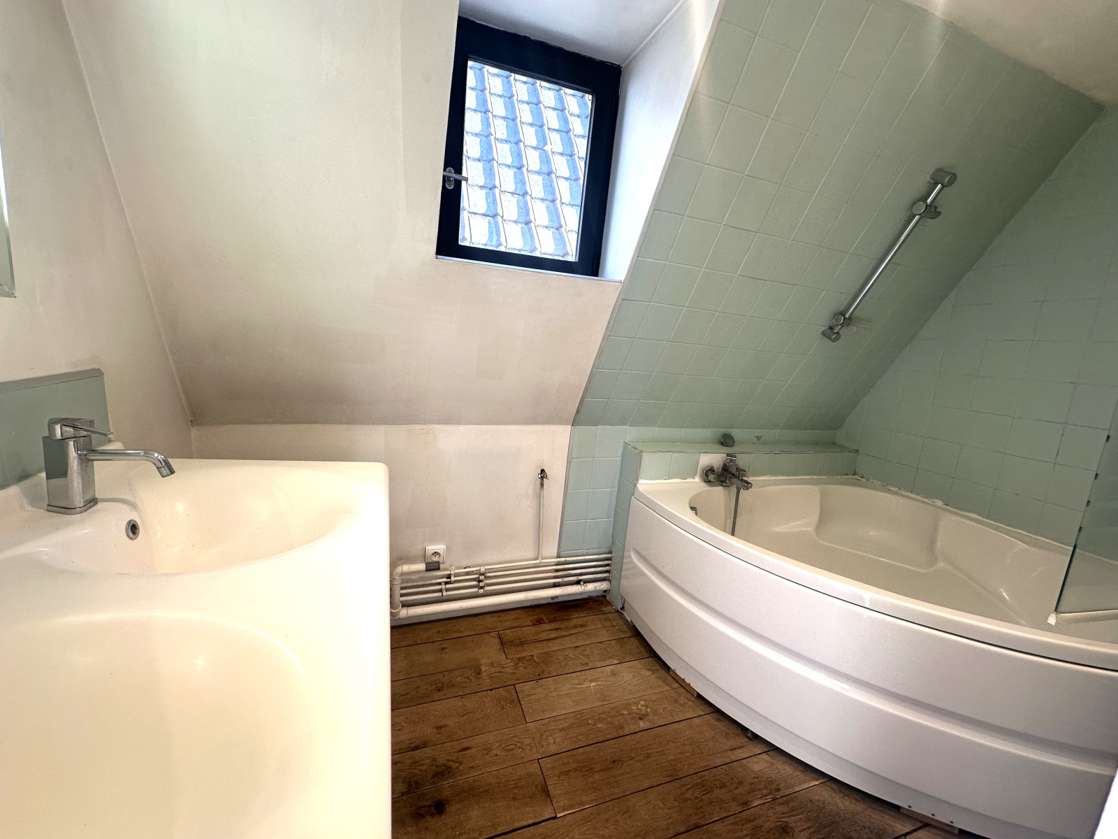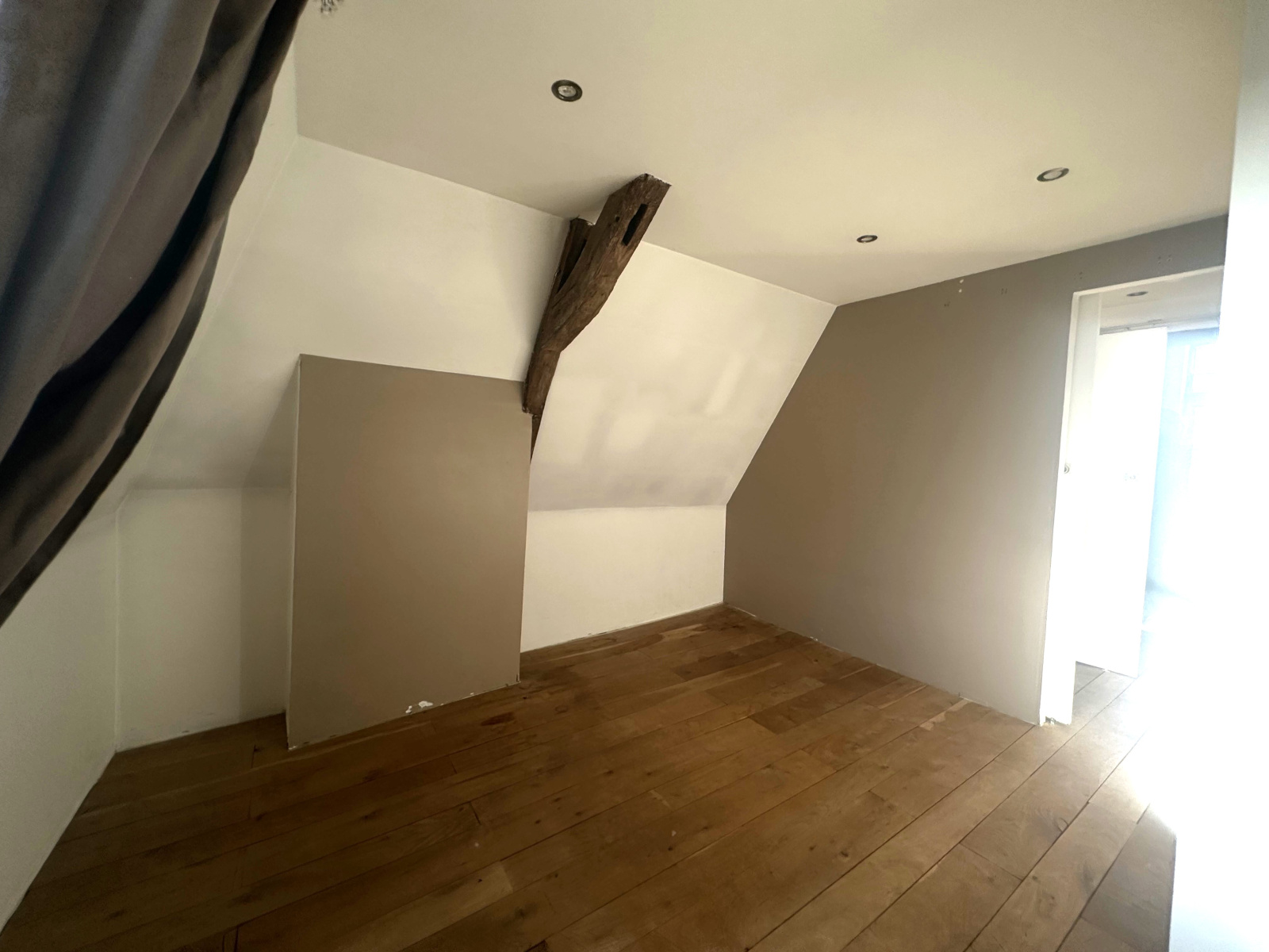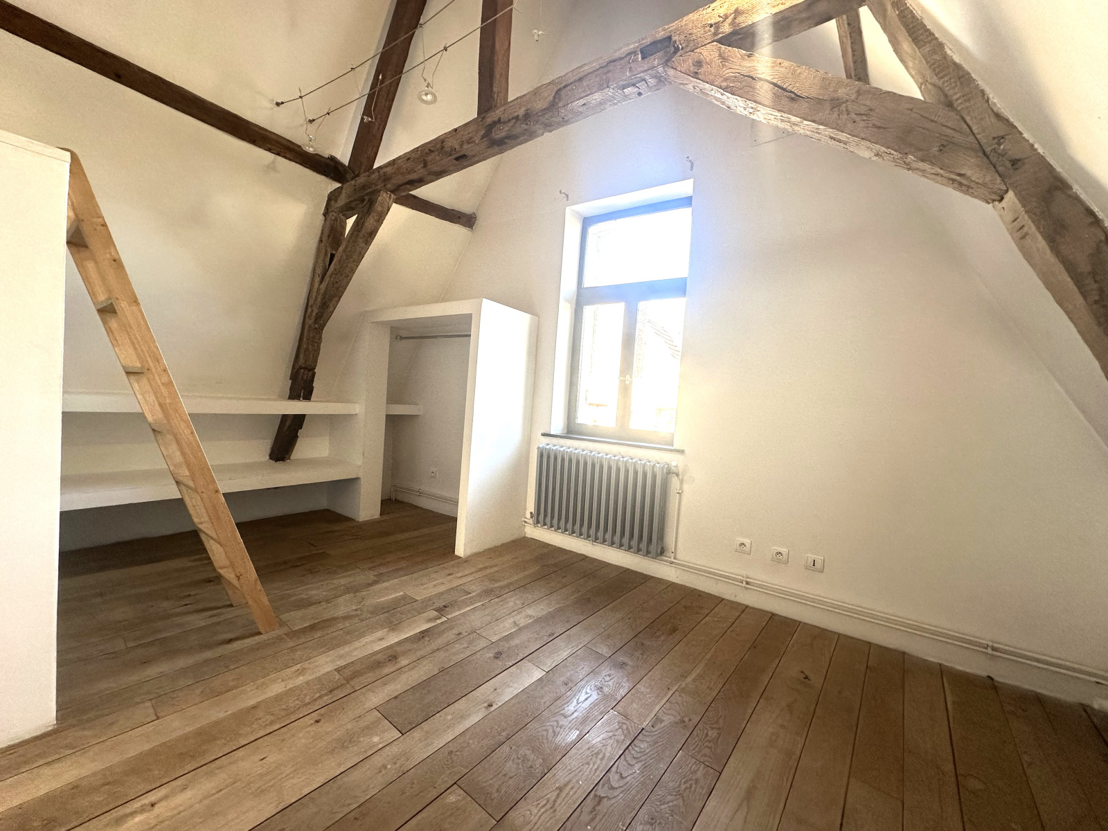Au 1er étage : 2 chambres, dont une avec pièce supplémentaire pour stockage, une salle de bains. Libre le 05/05.