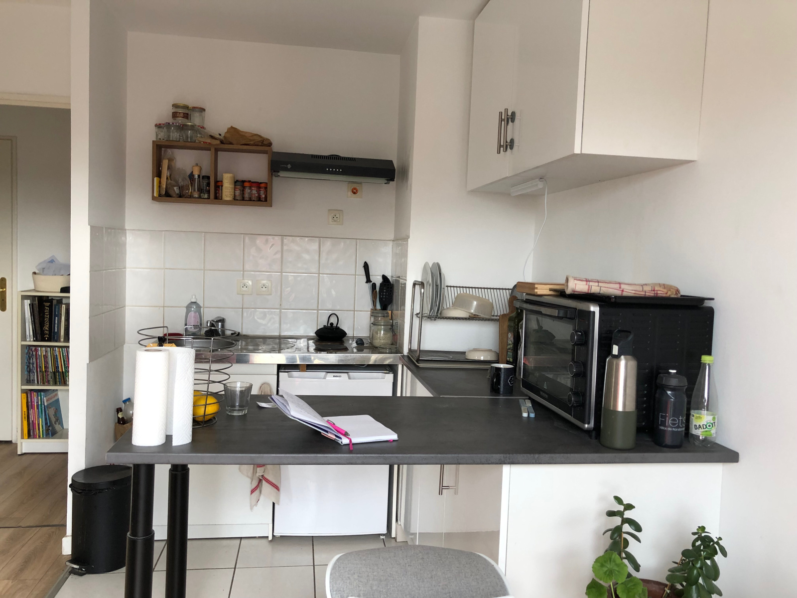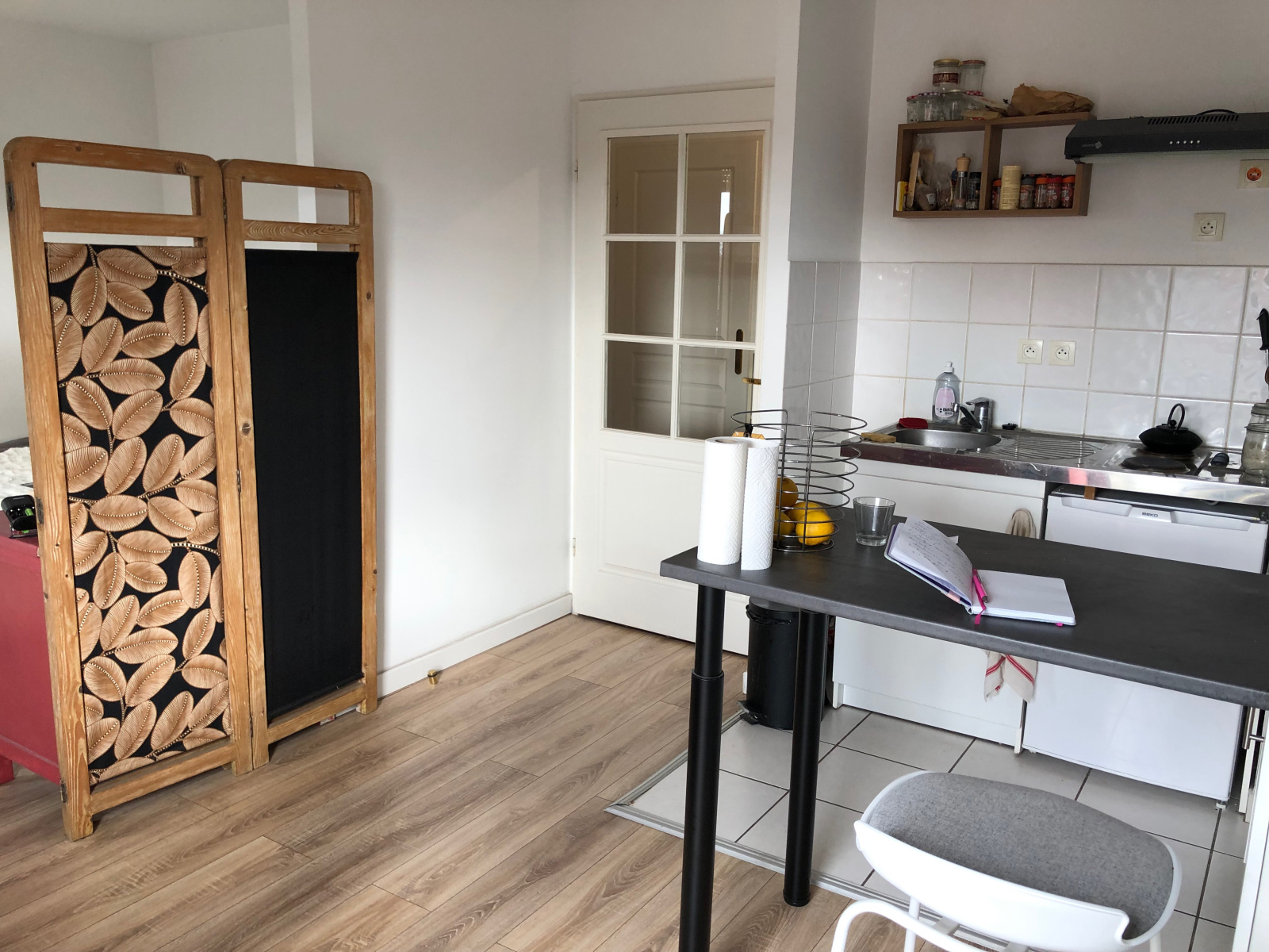 Hall, Pièce de vie avec cuisine ouverte et équipée avec mange debout et tabourets,, coin sommeil, SDB , WC