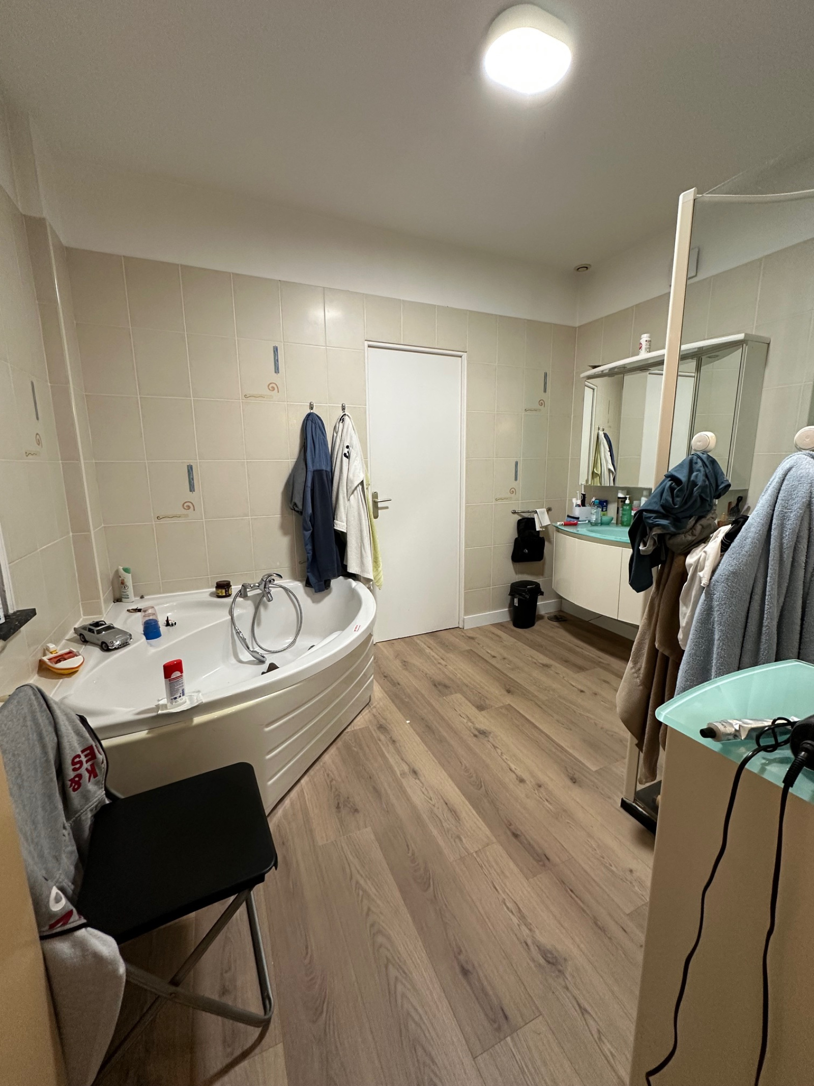 La maison comprend au rez de chaussée un hall d'entrée qui dessert une cuisine équipée et un grand salon séjour avec parquet ainsi qu'un bureau. A l'étage vous trouverez trois grandes chambres et une salle de bains avec baignoire et douche.