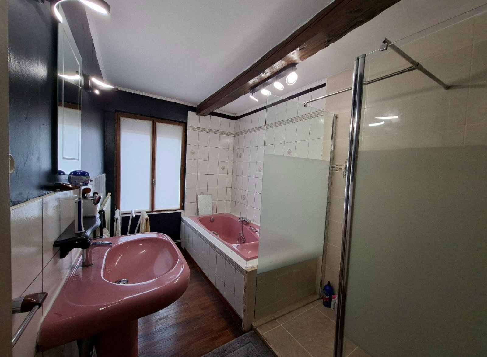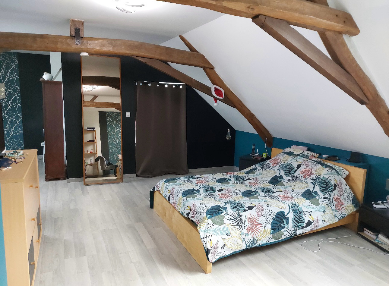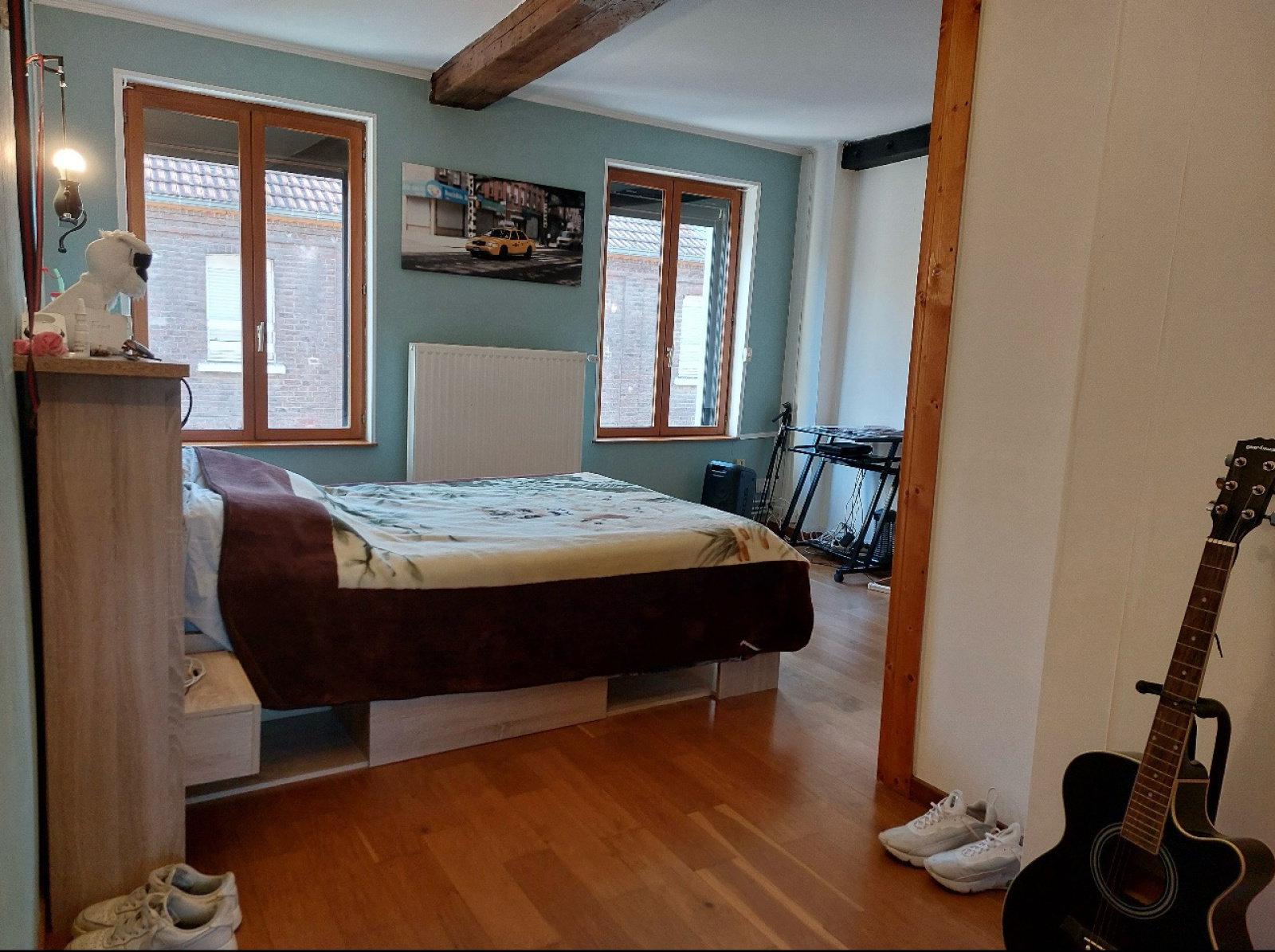 À l’étage, un grand palier dessert trois chambres, une salle de bains, un vestiaire et une petite buanderie.