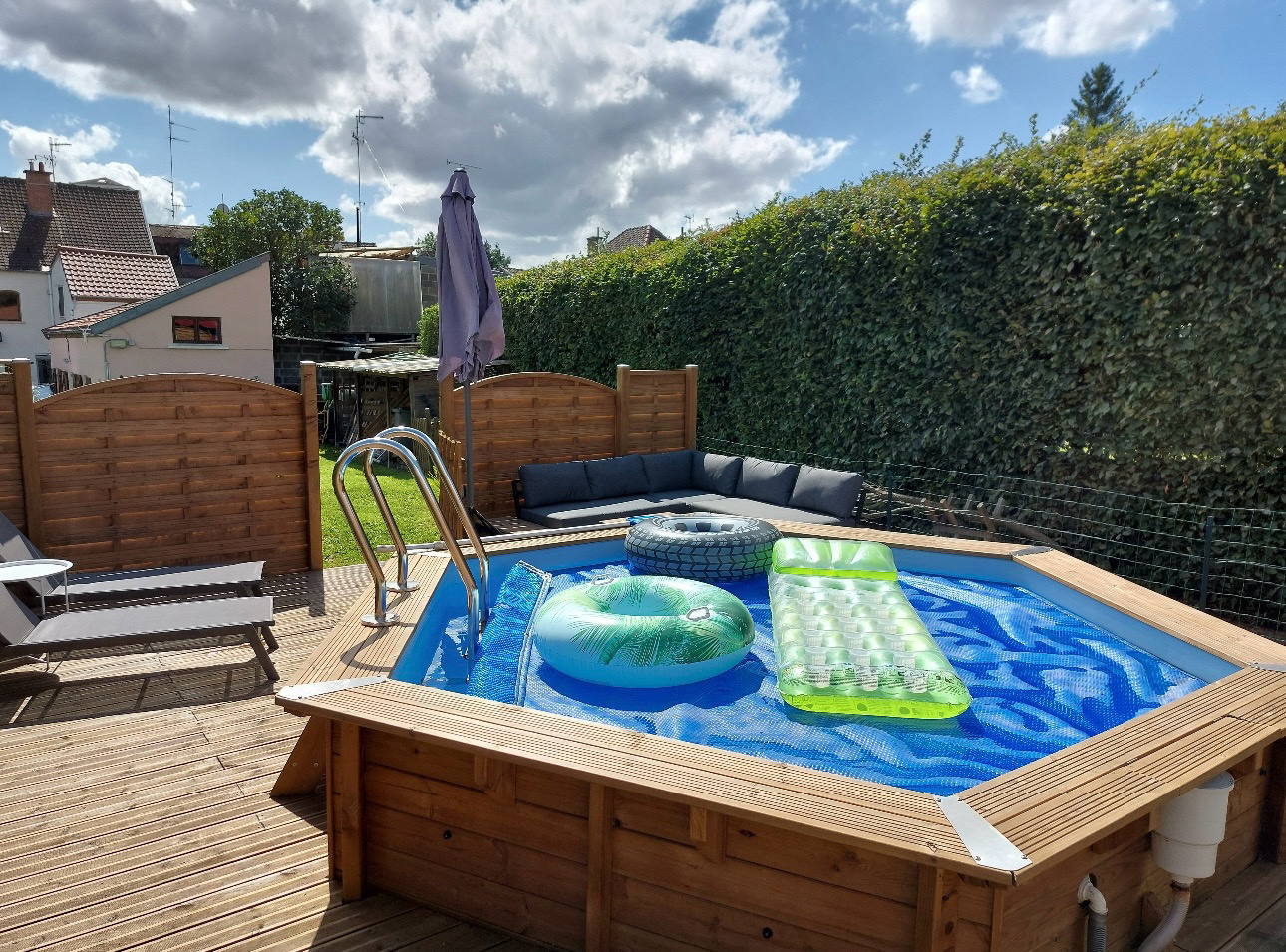 À l’extérieur, la maison offre un garage, un accès latéral permettant de rejoindre le jardin, une grande terrasse, un atelier ainsi qu’une belle piscine, idéale pour profiter pleinement des beaux jours.