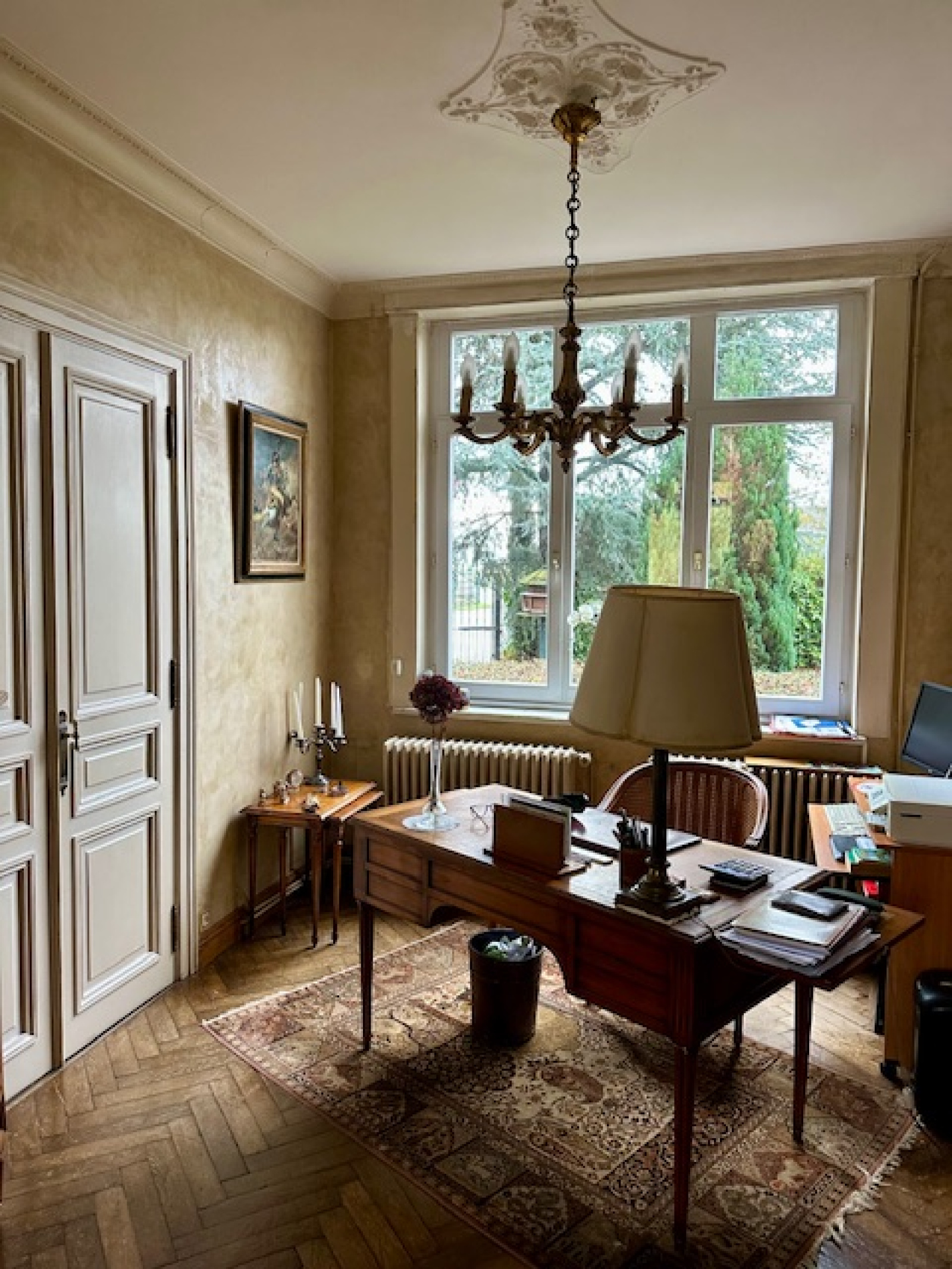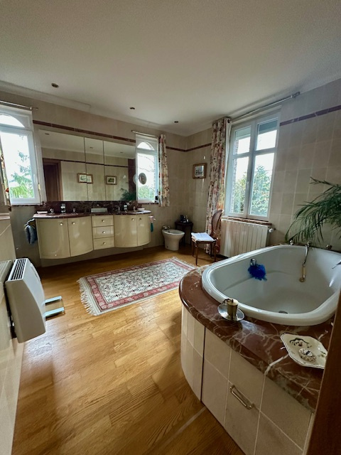 Dès l’entrée, un hall fonctionnel mène aux différentes pièces de vie : salon, séjour, salle à manger, ainsi qu’un bureau permettant le télétravail ou la création d’un espace dédié. Une petite salle à manger et une arrière-cuisine complètent le rez-de-chaussée et apportent une réelle praticité au quotidien.