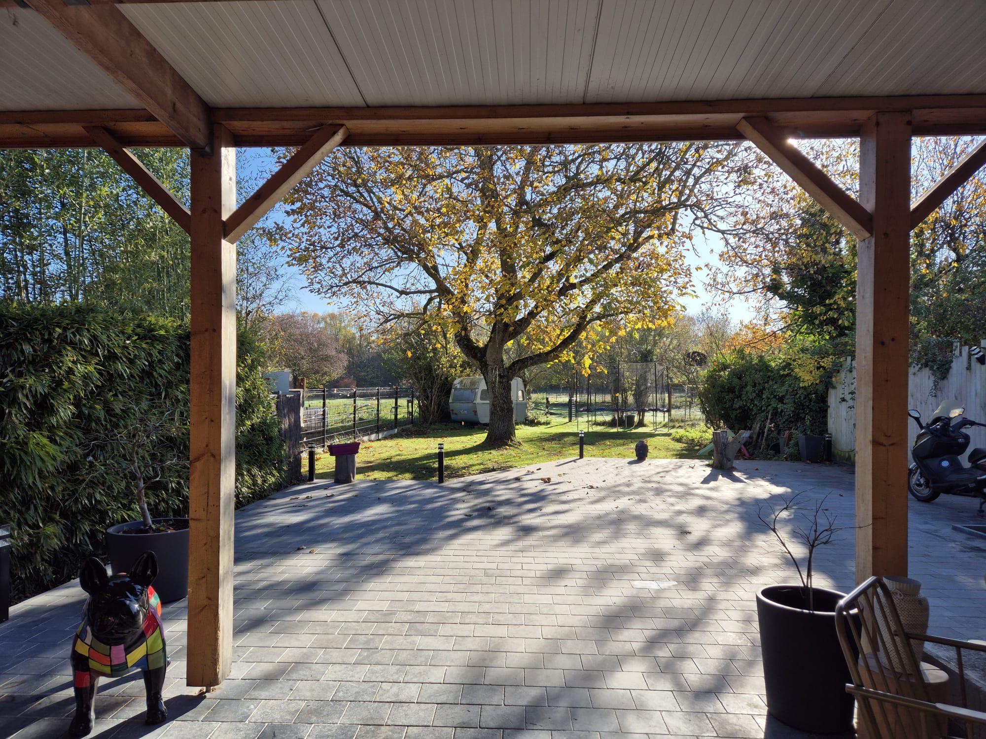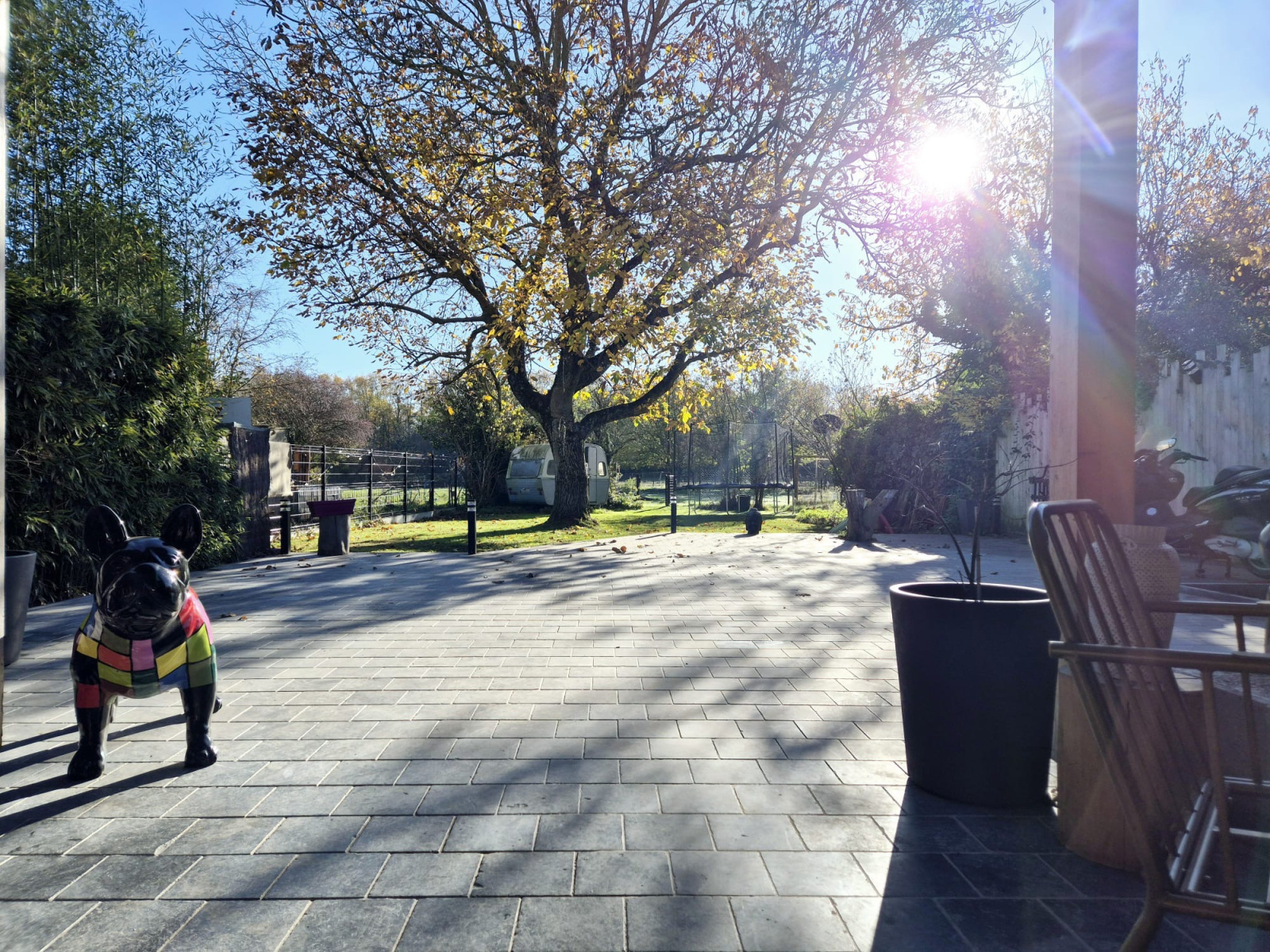 À l’extérieur, vous profiterez d’une grande terrasse en pierre bleue de 100 m², dont une partie couverte, parfaite pour les belles soirées d’été.